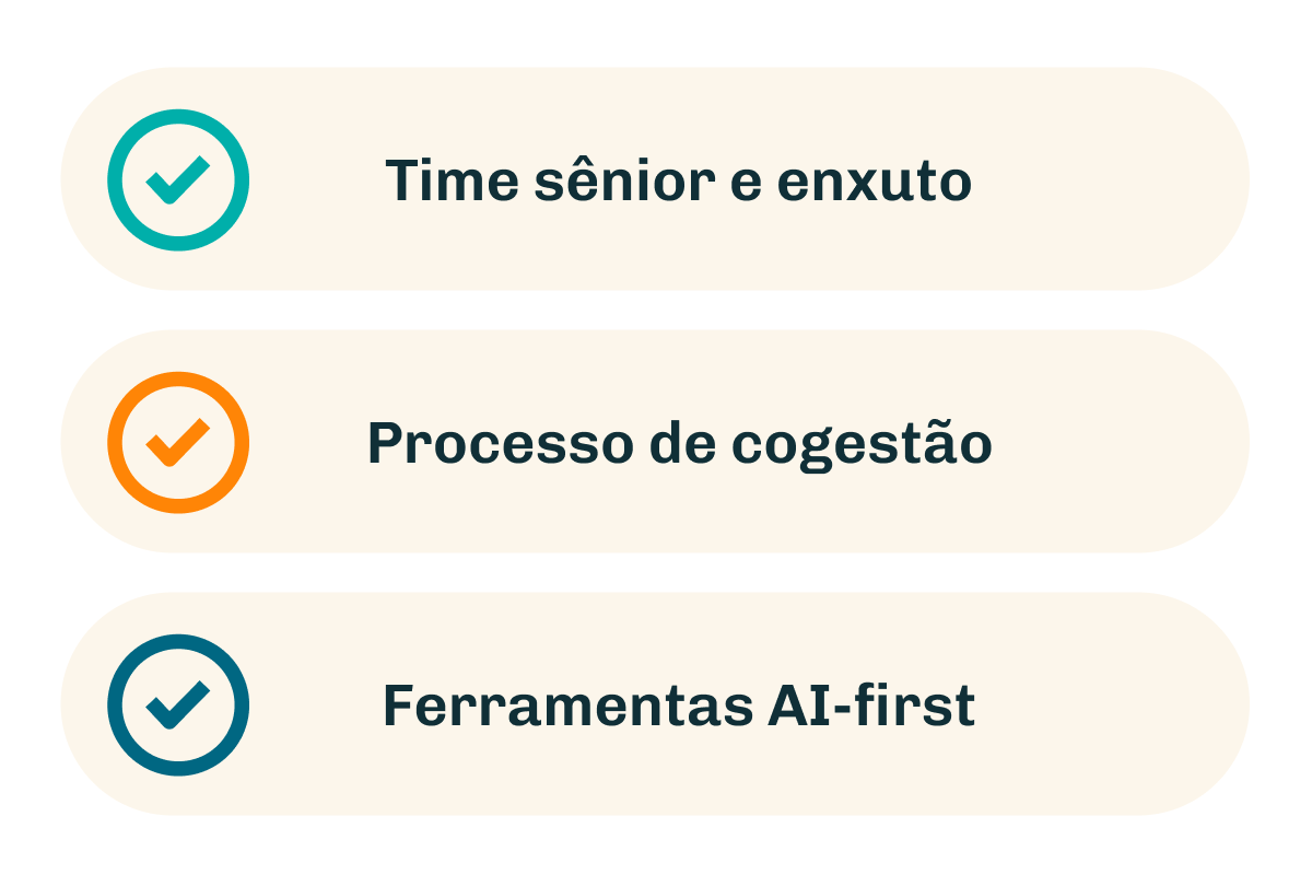 Como o resultado sustentável exige disciplina, clareza e envolvimento real, sempre atuamos com times enxutos e próximos ao cliente.